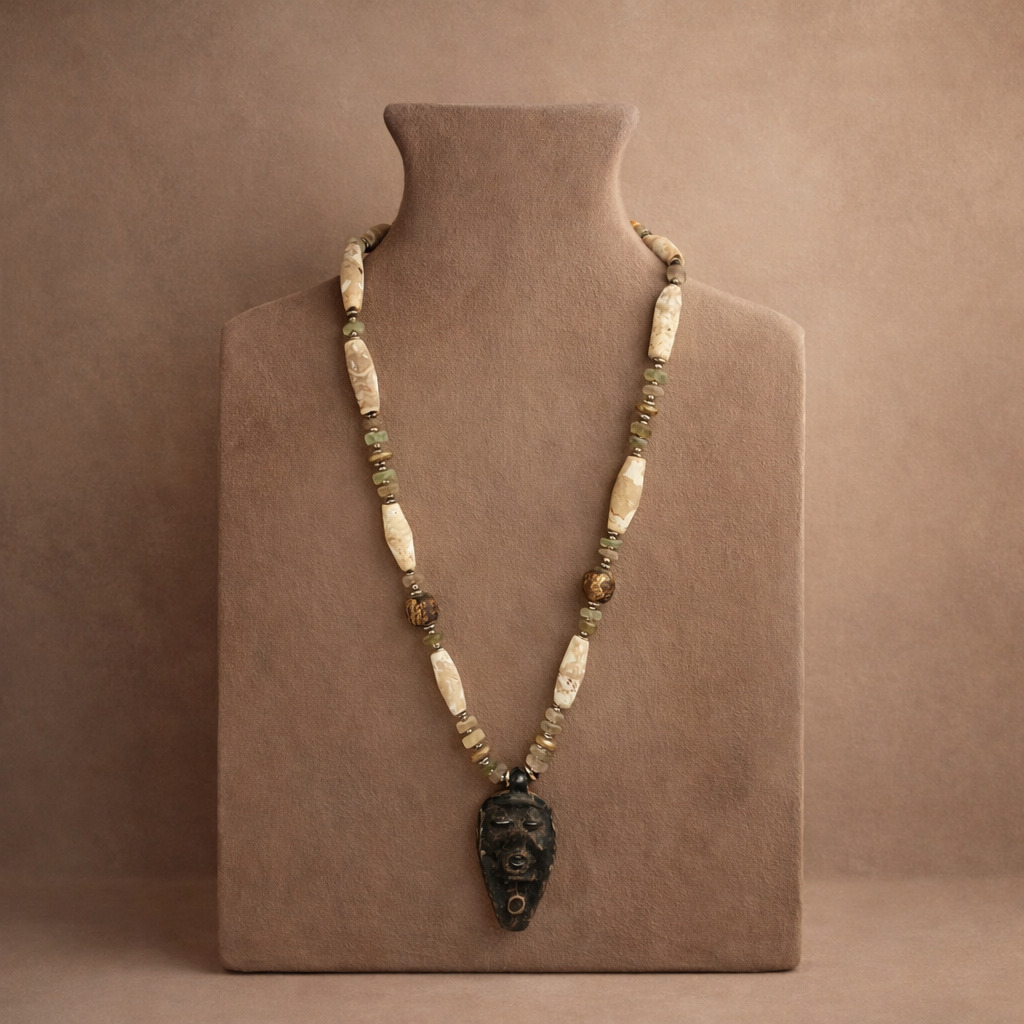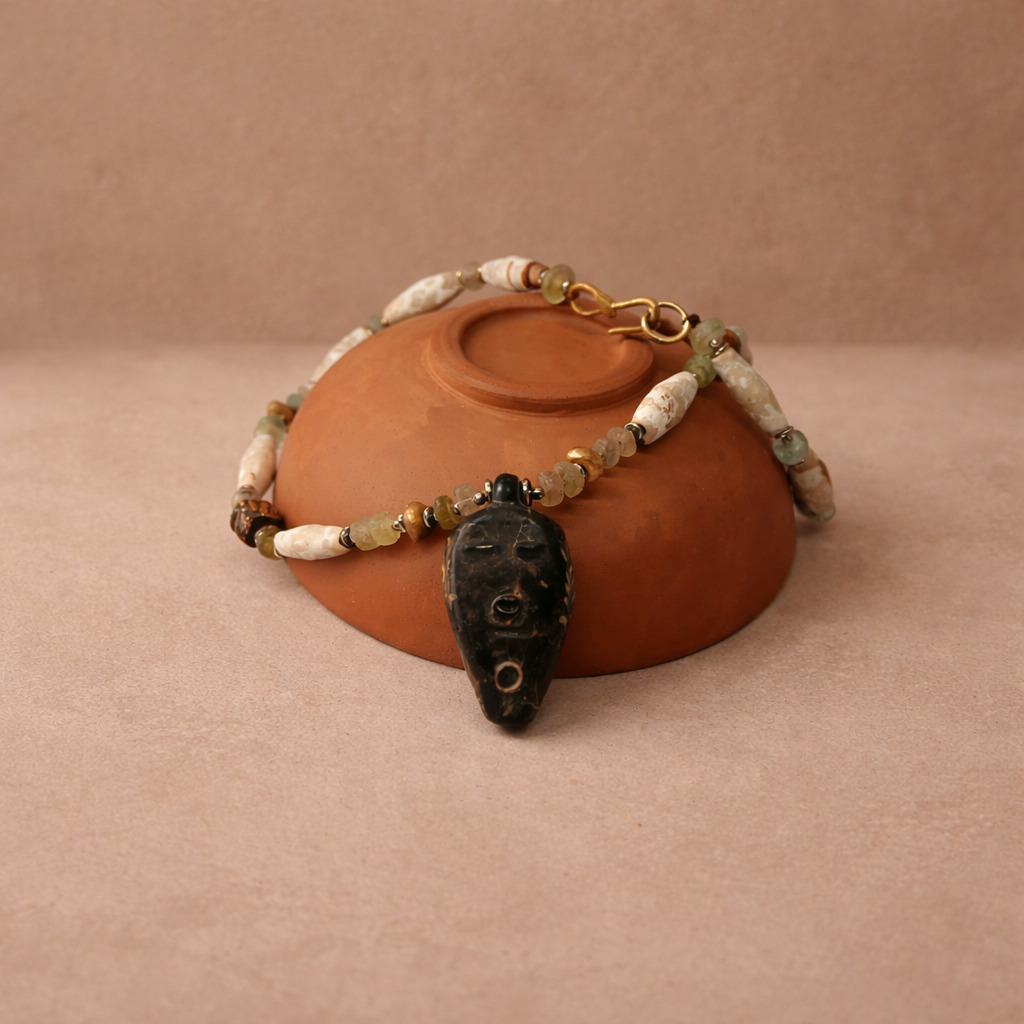 Afrika terakotasının sıcak toprak dokusu, eskitme camın nostaljik yüzeyiyle birleşerek güçlü ve etnik bir bütünlük sunar. Maske formundaki eski cam kolye ucu, tasarıma kültürel bir derinlik ve ritüelvari bir anlam katar. SEY DESIGN’ın el işçiliğini yansıtan bu özel parça; doğal malzemelerin ruhunu sanatsal bir estetikle buluşturarak günlük stile karakter dolu, özgün ve dikkat çekici bir dokunuş ekler.Afrika Terakotası Kolye, Afrika terakotası ve eskitme cam doğal taş dokusunu maske formunda el yapımı tasarım bir kolyeye dönüştürür.