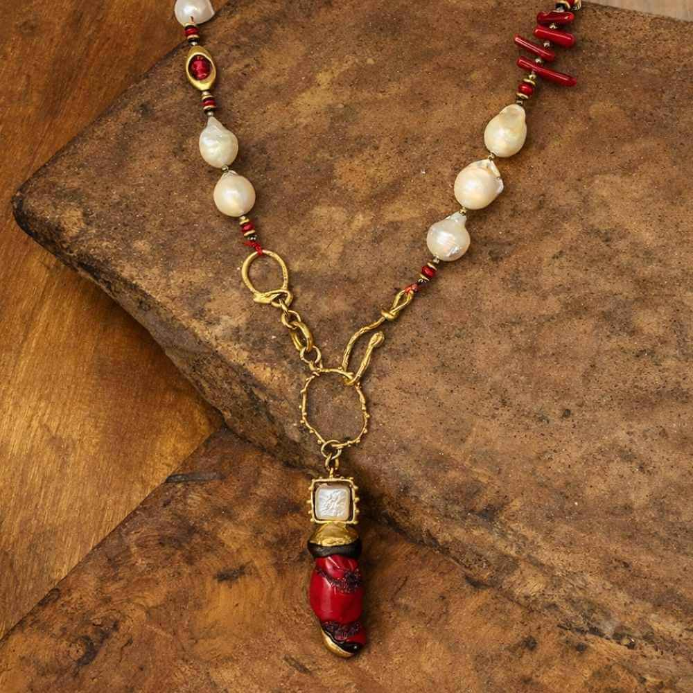 Barok incinin organik dokusu ile mercanın canlı enerjisini buluşturan bu tasarım, doğal taşların güçlü uyumunu modern bir yorumla sunar. Hematitin dengeli yapısı kolyeye karakteristik bir derinlik katarken pirinç üzeri altın kaplama detaylar tasarımın sofistike parıltısını tamamlar. SEY DESIGN’ın el işçiliğine dayanan özgün ruhunu taşıyan bu özel kolye, günlük stile zarif bir dokunuş eklerken uzun formuyla modern bir duruş sağlar.Barok İnci & Mercan Kolye, barok inci ve mercan doğal taşın enerjisini el yapımı tasarım detaylarıyla öne çıkaran uzun form bir kolyedir.