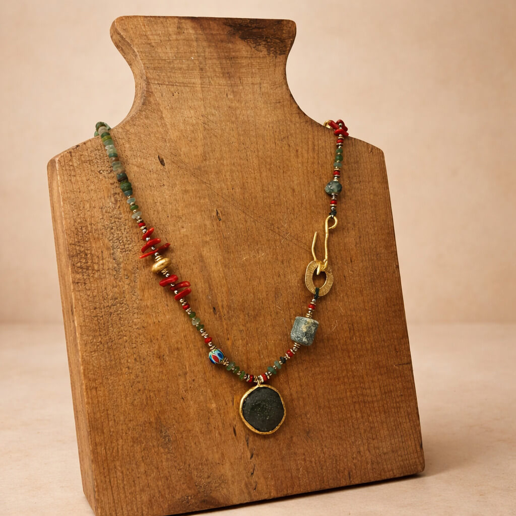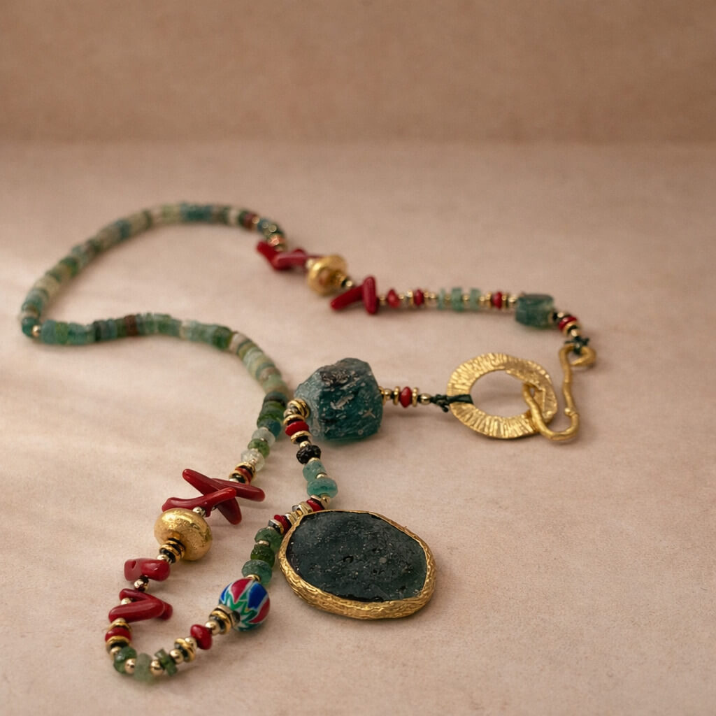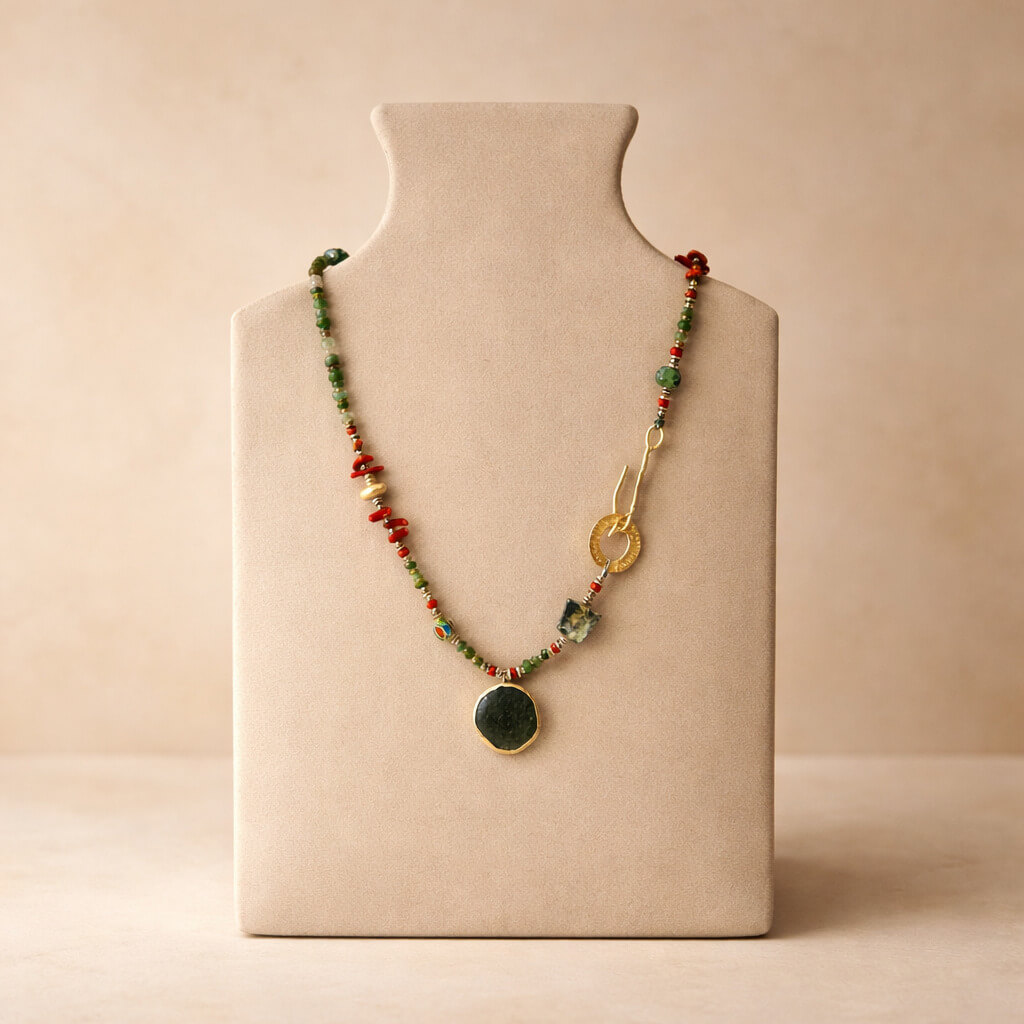 Roma camının kadim dokusu, eskitilmiş cam ucun nostaljik ışıltısıyla birleşerek zamana dokunan bir estetik sunar. Pirinç üzeri altın kaplama detaylar tasarıma modern bir parlaklık eklerken eskitilmiş cam kolye ucu, antik ruhu modern zarafetle buluşturan güçlü bir vurgu oluşturur. SEY DESIGN’ın el işçiliğini taşıyan bu özel kolye, günlük stile sade ama derin anlamlar taşıyan özgün bir dokunuş katar.Zamanın Camı Kolye, Roma camı ve eskitilmiş cam doğal taş görünümünü el yapımı tasarım çizgileriyle zamansız bir ifadeye dönüştürür.