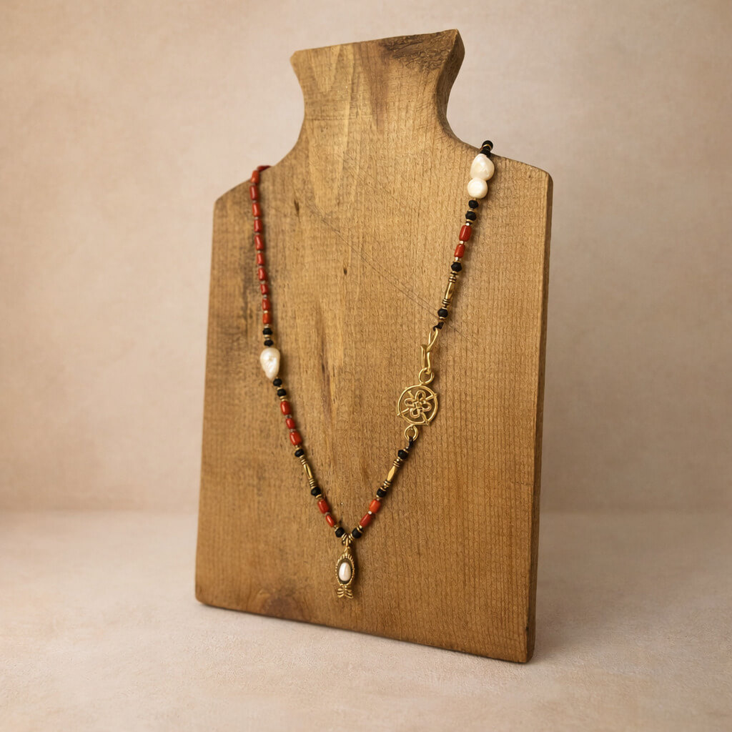 Mercanın doğal sıcaklığı ile barok incinin organik ışıltısı bir araya gelerek zarif ve akıcı bir uyum yaratır. Pirinç üzeri altın kaplama detaylar tasarıma modern bir parıltı katarken inci balık formundaki kolye ucu, tasarımın şiirsel ve narin merkezini oluşturur. SEY DESIGN’ın el işçiliğini yansıtan bu özel parça; deniz estetiği, doğal taş enerjisi ve minimal zarafeti günlük stile etkileyici bir dokunuşla taşır.İnci Balığı Kolye, mercan ve barok inci doğal taşını balık formunda el yapımı tasarım bir dille yorumlayan şiirsel bir kolyedir.