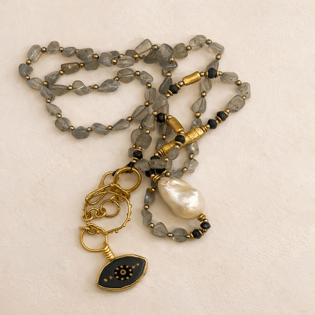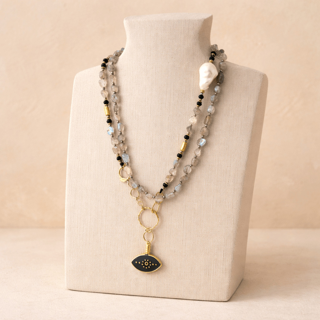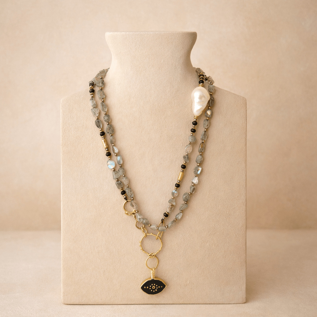 Labradoritin mistik ışığı, incinin narin parlaklığı ve pirinç üzeri altın kaplamanın modern dokusuyla birleşerek derin ve zarif bir uyum oluşturur. İşlemeli porselen göz sembollü kolye ucu, tasarıma koruyucu bir anlam ve güçlü bir estetik katar. SEY DESIGN’ın el işçiliğini yansıtan bu özel tasarım; doğal taşların enerjisini, şiirsel bir ifadeyle modern stile taşıyan özgün ve etkileyici bir parçadır.Labradorit’in Bakışı Kolye, labradorit ve inci doğal taş birlikteliğini porselen göz sembollü el yapımı tasarım bir kolye haline getirir.