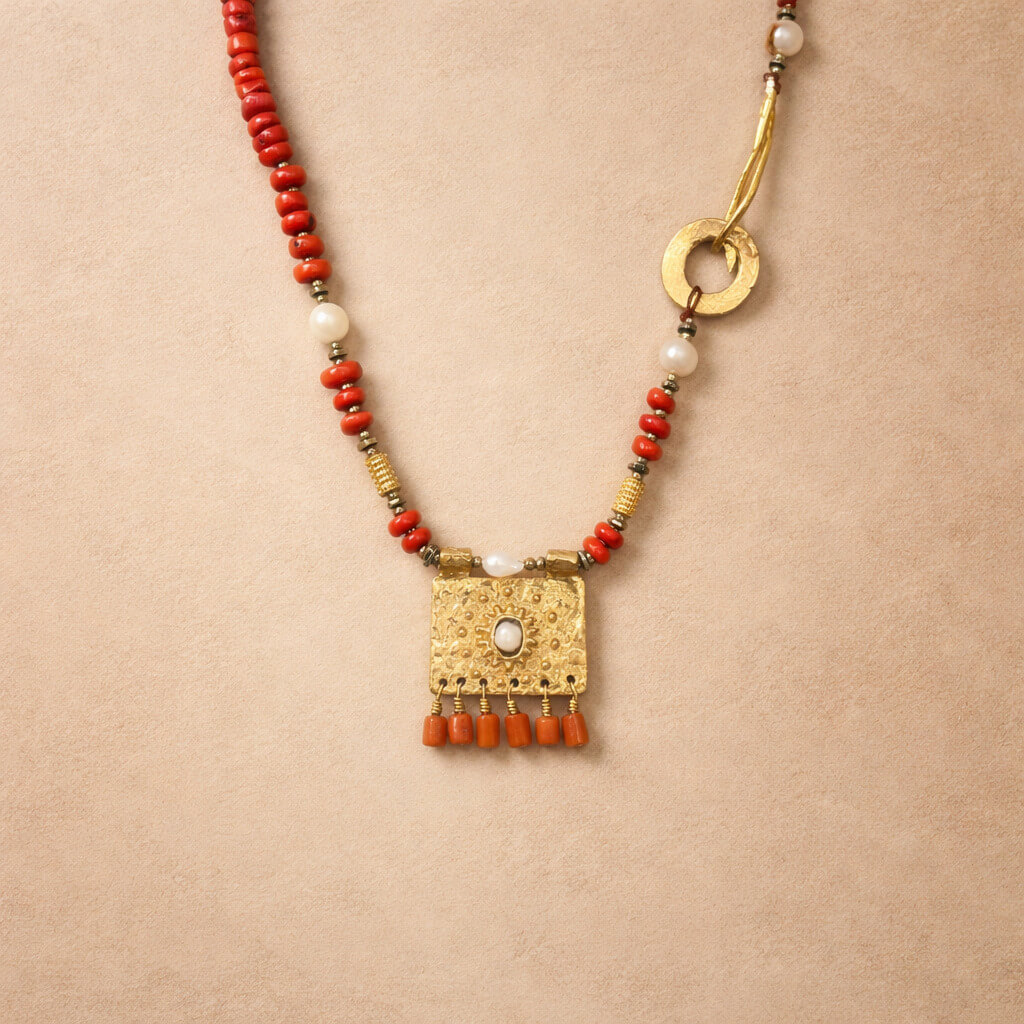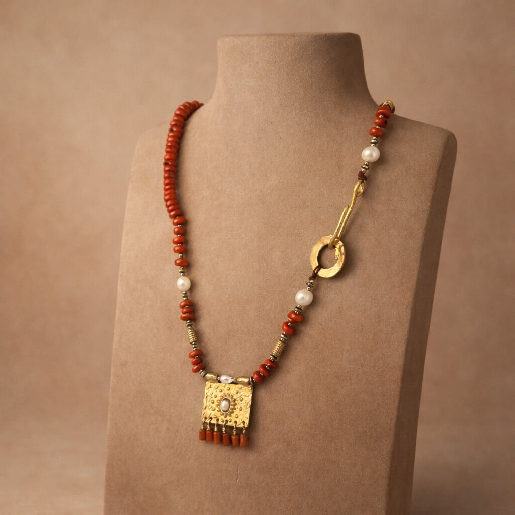 Mercanın doğal dokusu ile incinin zarif parlaklığı bir araya gelerek sade ama etkileyici bir uyum oluşturur. Pirinç üzeri altın kaplama detaylar tasarıma modern bir ışıltı katarken inci detaylı kolye ucu tasarımın merkezinde sofistike bir vurgu yaratır. SEY DESIGN’ın özgün el işçiliğini yansıtan bu özel parça, günlük stile doğal bir zarafet ve minimal bir şıklık katan zarif bir aksesuar seçeneğidir