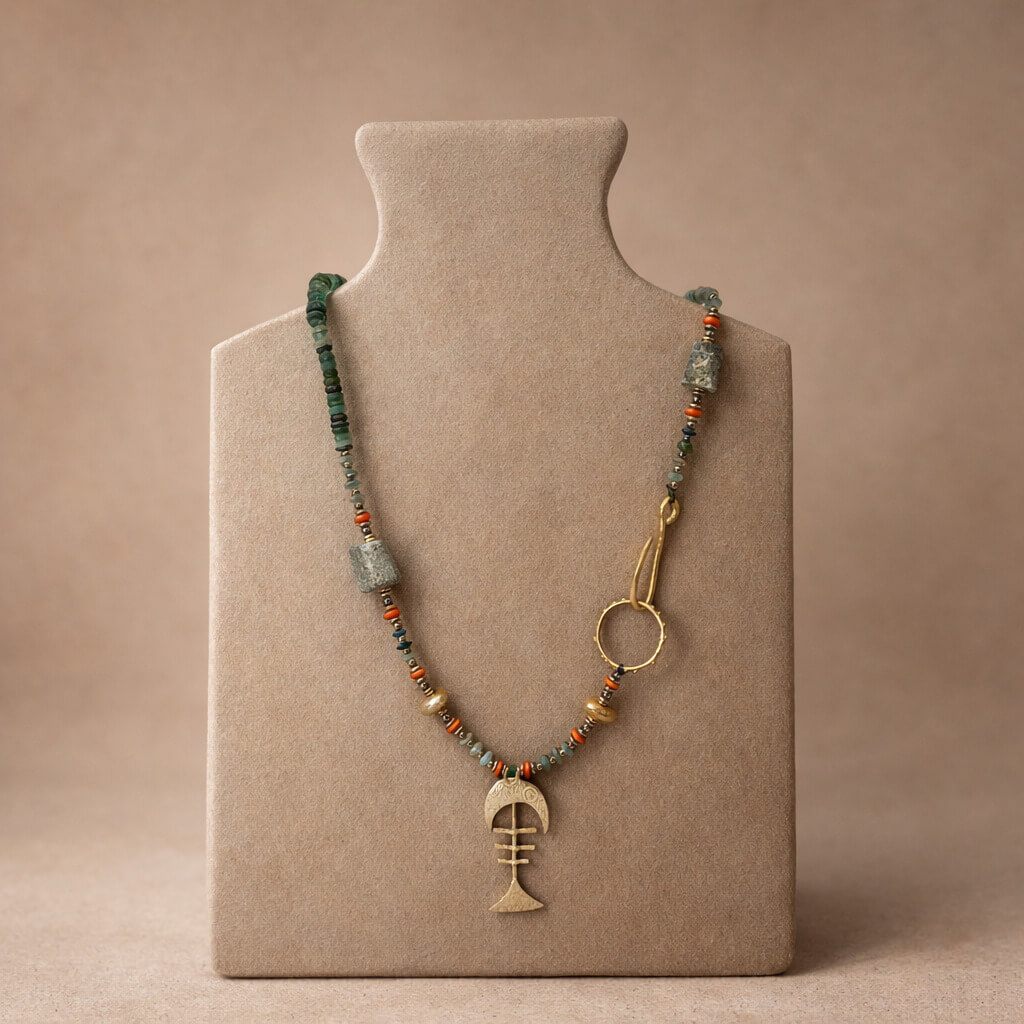 Roma camının otantik dokusu, pirinç üzeri altın kaplamanın modern ışıltısıyla birleşerek zamansız bir bütünlük sunar. Balık kılçığı formundaki pirinç kolye ucu, tasarımın merkezine deniz ruhunu taşıyan özgün ve sembolik bir vurgu ekler. SEY DESIGN’ın el işçiliğini yansıtan bu özel parça; antik estetikle modern zarafeti bir araya getirerek günlük stile hafif, akıcı ve karakterli bir dokunuş kazandırır.Roma Akıntısı Kolye, Roma camı doğal taşın antik dokusunu balık kılçığı formunda el yapımı tasarım ile modernleştiren bir kolyedir.