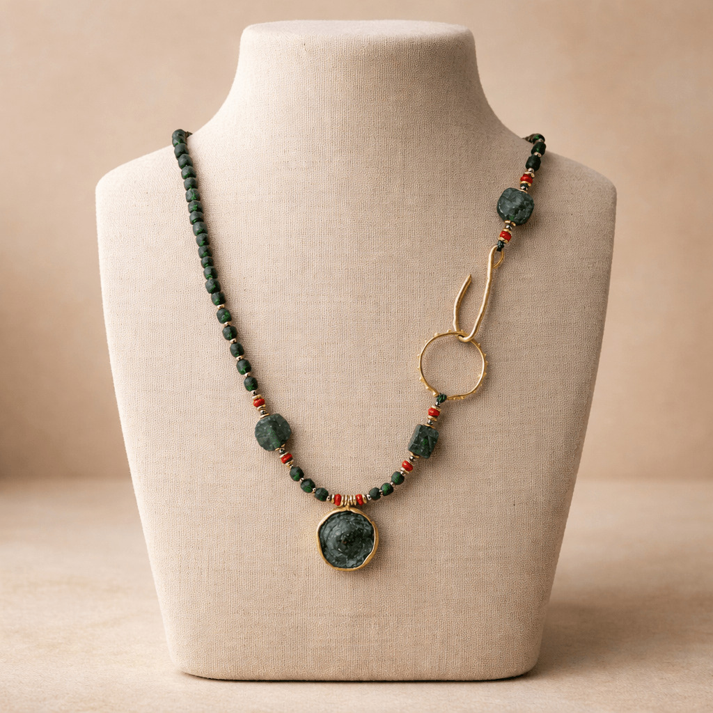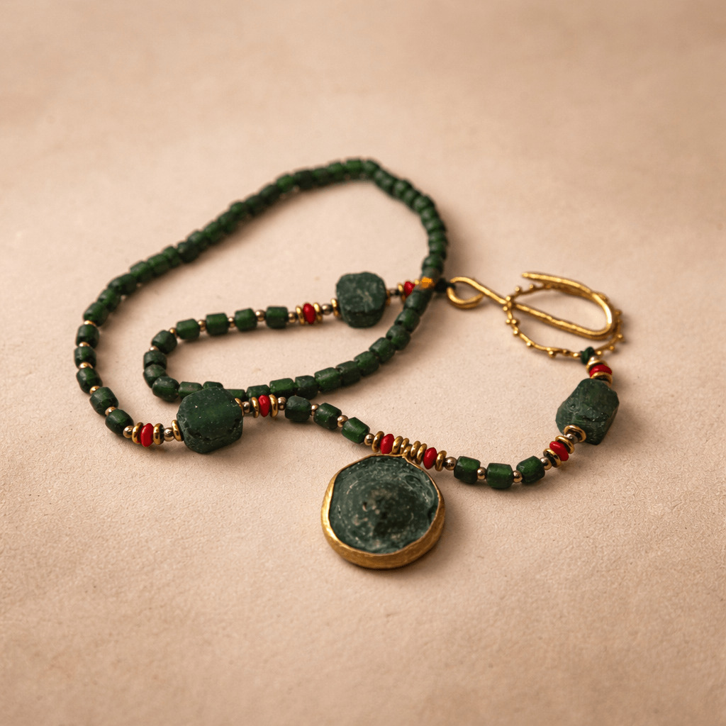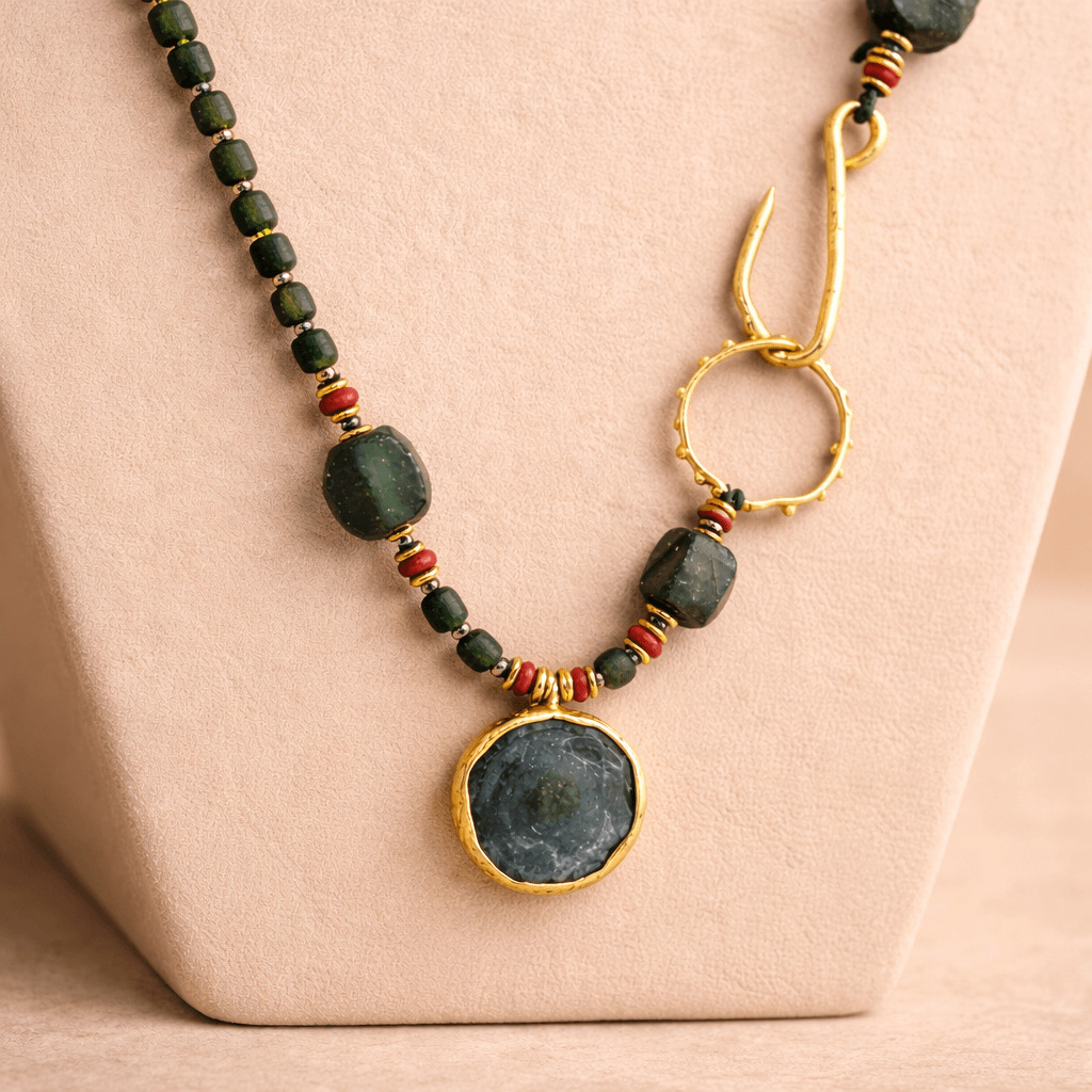 Roma camının antik dokusu, incinin zarif parlaklığı ve pirinç üzeri altın kaplamanın modern ışıltısıyla bütünleşerek karakterli bir tasarım oluşturur. Geometrik işlenmiş yedim taşı kolye ucu, tasarıma hem mistik hem de özgün bir vurgu katar. SEY DESIGN’ın el işçiliğiyle şekillenen bu özel parça; doğal taşların enerjisini modern çizgilerle buluşturarak günlük stile zarif, anlamlı ve etkileyici bir dokunuş kazandırır.Bu versiyon Geometrik Yedim Kolye de Roma camı ve inci doğal taşları, el yapımı tasarım geometrik uç ile tamamlayan özgün bir kolyedir.